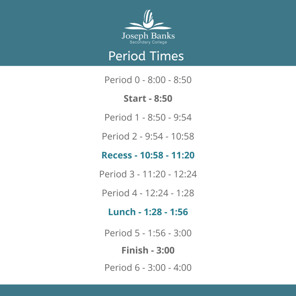 Period Times Please see the College period times below. Some students may also attend a Period 0 and/or 6 depending on the subject or course they are enrolled in. Students are allocated areas in which they can enjoy their recess and lunch breaks. You can view the area map here.